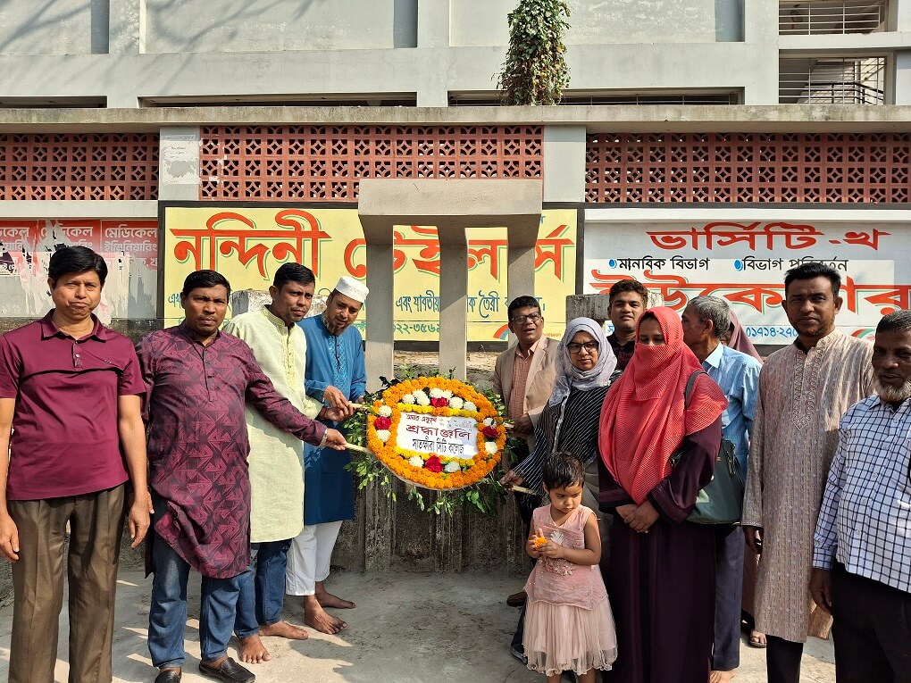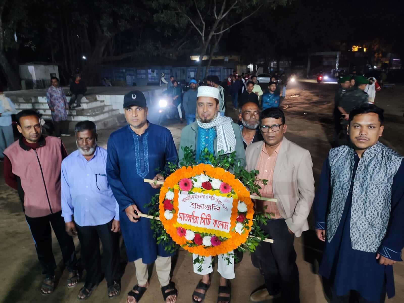 শ্রদ্ধা নিবেদন করেন পরিচালনা পরিষদের সদস্য অধ্যক্ষ হাফিজুল আল মাহমুদ, অধ্যক্ষ (ভারপ্রাপ্ত) মোঃ মনিরুজ্জামান, উপাধ্যক্ষ মোঃ আলতাফ হোসেন, সহযোগী অধ্যাপক শফিউল আলম এবং আরিফ হোসেনসহ অন্যান্য শিক্ষক-কর্মচারীবৃন্দ।